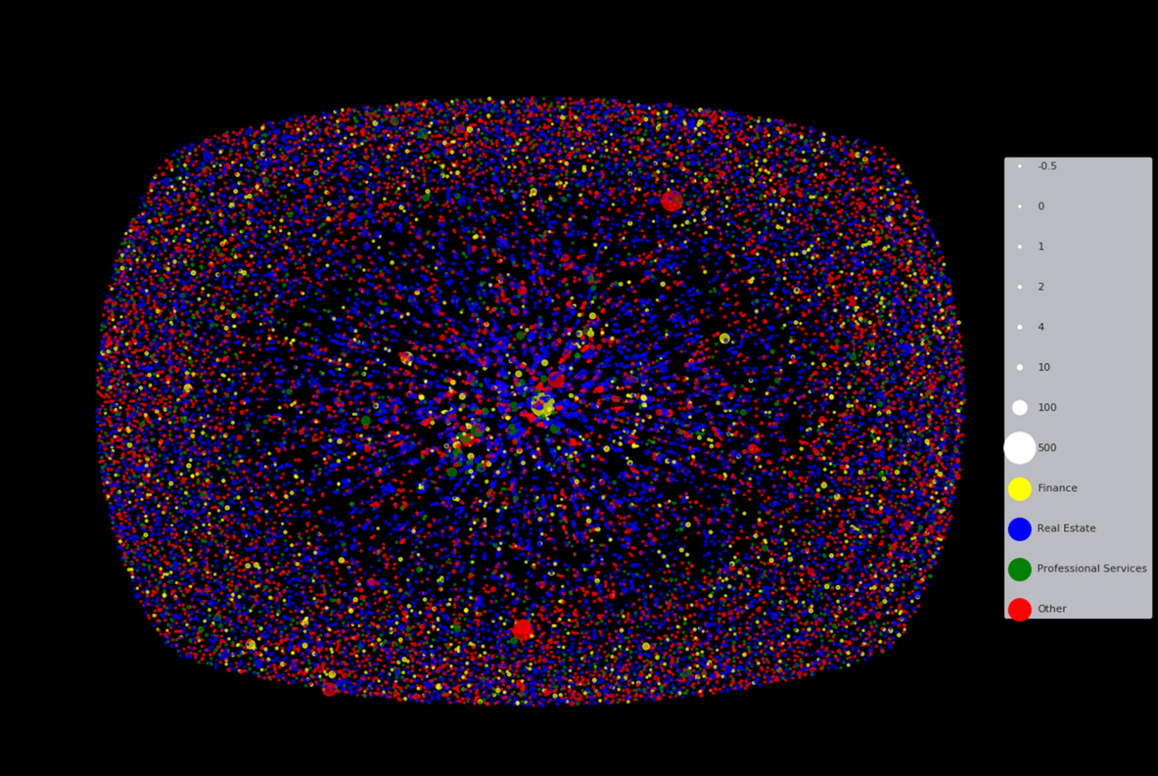 该图展示了Lester及其同事研究的10,000家与合伙企业相关的企业。圆点的大小表示合伙企业的复杂程度;其所属行业用颜色表示。靠近图中心的合伙企业由拥有更多额外合伙企业的纳税人所有。
