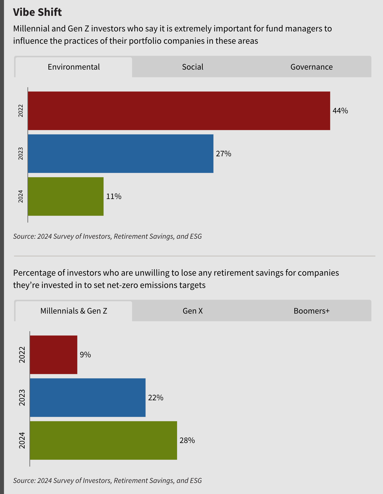 然而,年轻投资者对ESG的热情在2023年开始减弱。在2024年秋季进行的最新调查中,这一热情跌至谷底。例如,2022年,44%的年轻投资者认为,投资公司利用其规模和投票权来影响其投资组合公司的环境优先事项“极其重要” 。第二年,27%的人有这种感觉。而2024年呢?只有11%。